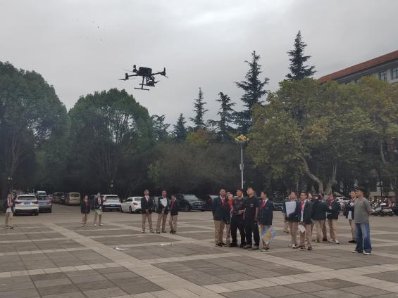 最后,活动在户外广场进行了无人机遥感观测演示和光谱仪操作。一架多旋翼无人机在工作人员的操控下腾空而起,引来同学们阵阵惊叹。无人机在空中按照预定航线飞行,其搭载的高清相机实时将地面影像传回显示屏,快速、精准地完成对地观测任务,展示了遥感技术在农业普查、应急救灾等领域发挥着越来越重要的作用。