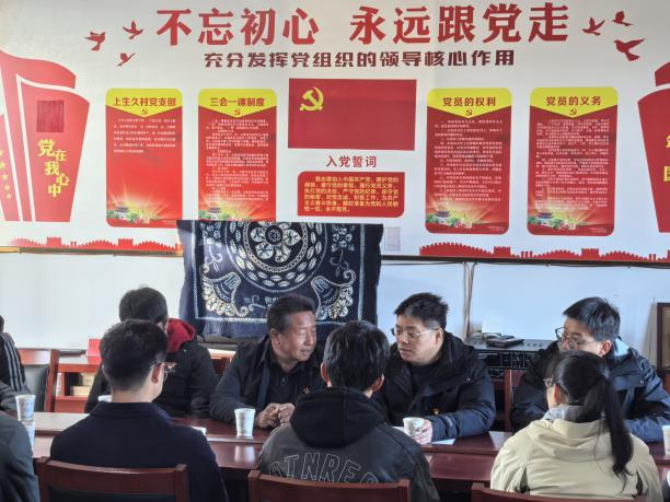 在上生久村党员活动室,创新团队党支部与上生久村基层党支部成员举行了座谈交流。创新团队党支部书记唐伯惠教授首先结合本地实际,围绕党的二十届四中全会提出的重大决策部署、乡村振兴、生态文明建设等内容,进行了系统宣讲和解读;随后,介绍了科技小院和野外科学观测站的情况。之后,上生久村党支部书记李继春介绍了该村在党建引领下,发展特色农业种植、乡村旅游业,促进村民增收致富的路径与成效,以及当前面临的挑战等情况。